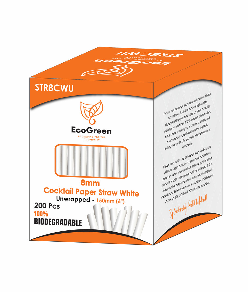 Ecogreen 6" Cocktail Paper Straws offer an eco-friendly alternative to plastic straws, measuring 8mm in diameter for comfortable sipping. These unwrapped straws come in a bulk pack of 200, ideal for bars, restaurants, or events prioritizing sustainability. Made from biodegradable materials, they reduce environmental impact without compromising on quality or user experience. Perfect for cocktails and cold beverages, they support responsible consumption while maintaining convenience and hygiene.