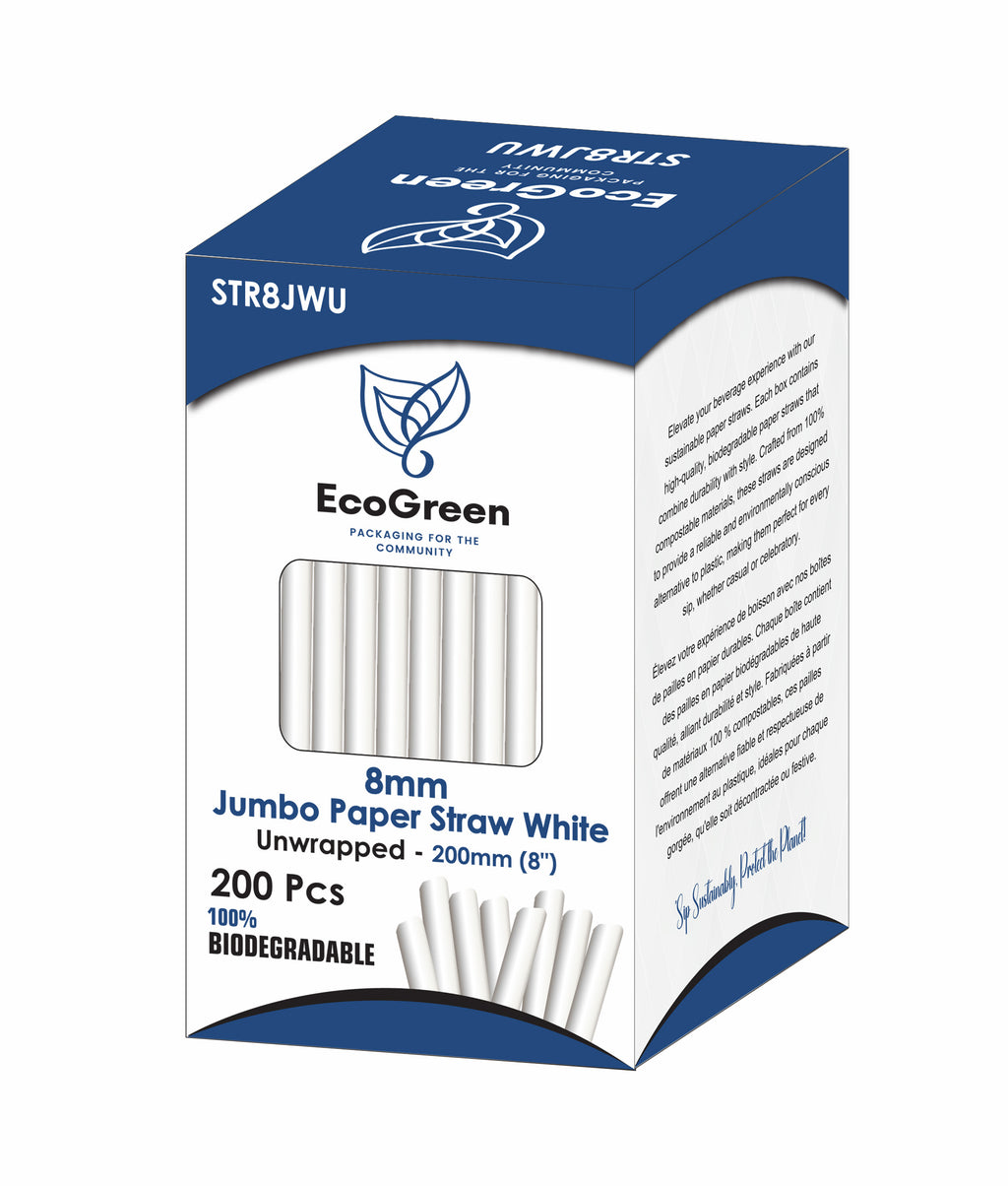 Ecogreen 8" Jumbo Paper Straws offer an eco-friendly alternative for beverage service, made from biodegradable materials to reduce plastic waste. These unwrapped straws provide hygienic convenience and are ideal for thick drinks like smoothies and milkshakes. Supplied in a bulk pack of 200, they support sustainable business practices without compromising on durability or functionality.