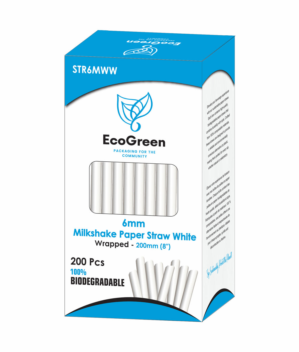 These 8-inch Ecogreen milkshake paper straws offer an eco-friendly alternative to plastic, designed for thick beverages. Individually wrapped for hygiene, this pack of 200 ensures ample supply for commercial or personal use. Made from biodegradable materials, they reduce environmental impact while maintaining durability and comfort during use. Perfect for cafes and restaurants aiming to adopt sustainable practices without compromising customer experience.